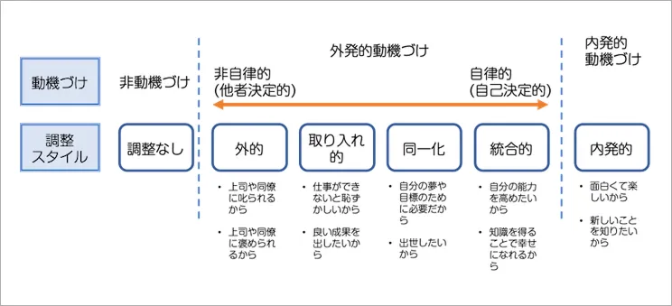 また、動機づけには「外発的動機づけ」から「内発的動機づけ」に至るまでに5段階のフェーズがあるとされています。